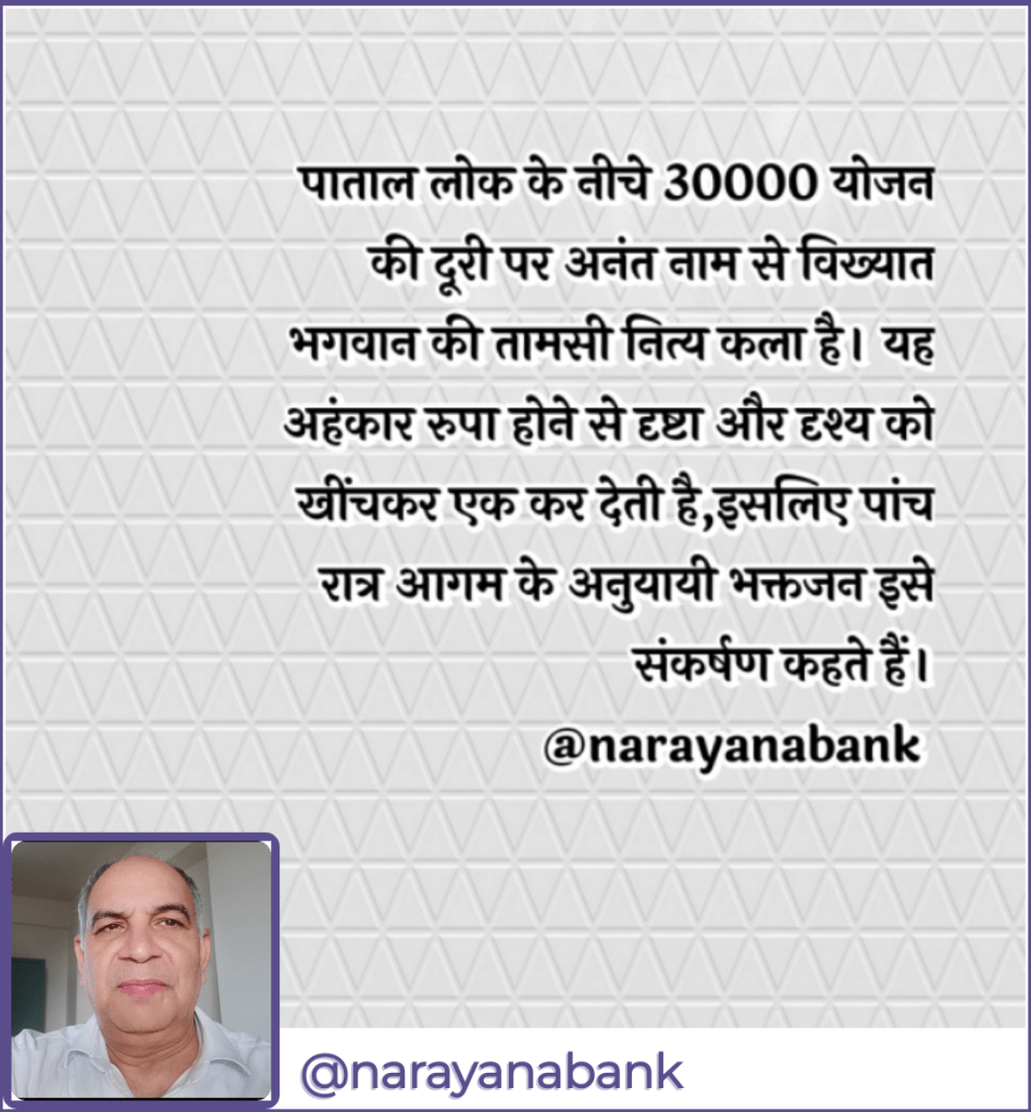 पाताल लोक के नीचे 30000 योजन की दूरी पर अनंत नाम से विख्यात भगवान की तामसी नित्य कला है। यह अहंकार रुपा होने से दृष्टा और दृश्य को खींचकर एक कर देती है,इसलिए पांच रात्र आगम के अनुयायी भक्तजन इसे संकर्षण कहते हैं।